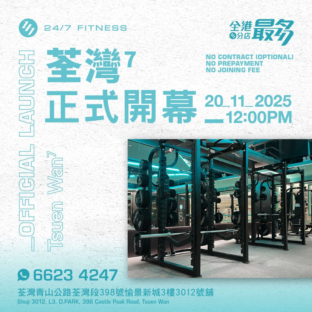24/7 FITNESS荃湾第七分店(愉景新城)于11月20日正式开幕!
