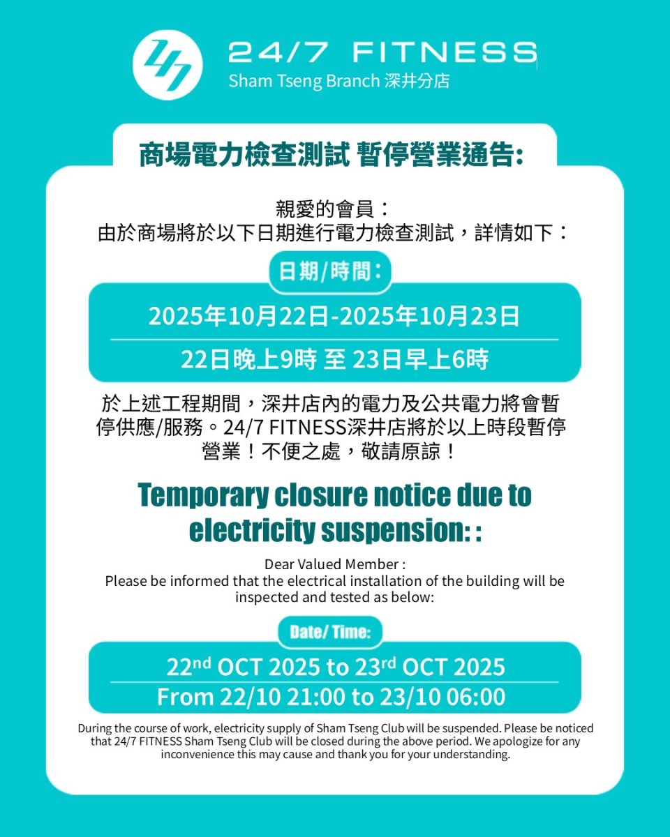 Sham Tseng Club: Temporary Closure Notice due to Electricity Suspension