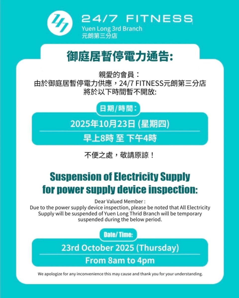 Yuen Long Third Branch: Temporary closure notice due to electricity suspension